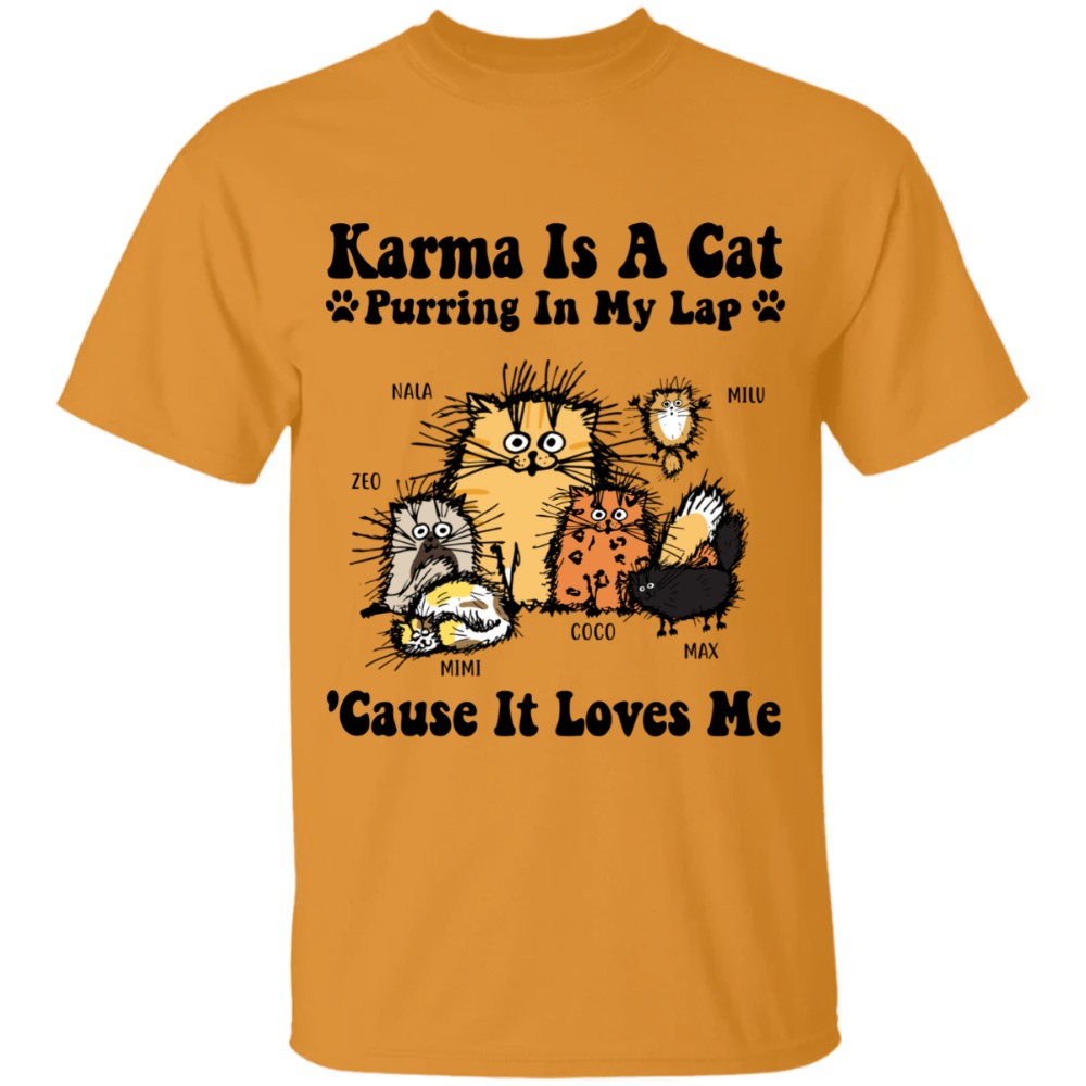 Karma is a cat purring in my lap because it loves me custom cat’s names up to 6 cats personalized tie dye t-shirt – BT – 1789935